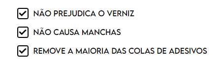 Se necessário repita a operação; o produto tem afinidade com a a maioria de tipos de colas de adesivos, porém é necessário um pequeno teste antes para ter a certeza da compatibilidade do produto com a contaminação.